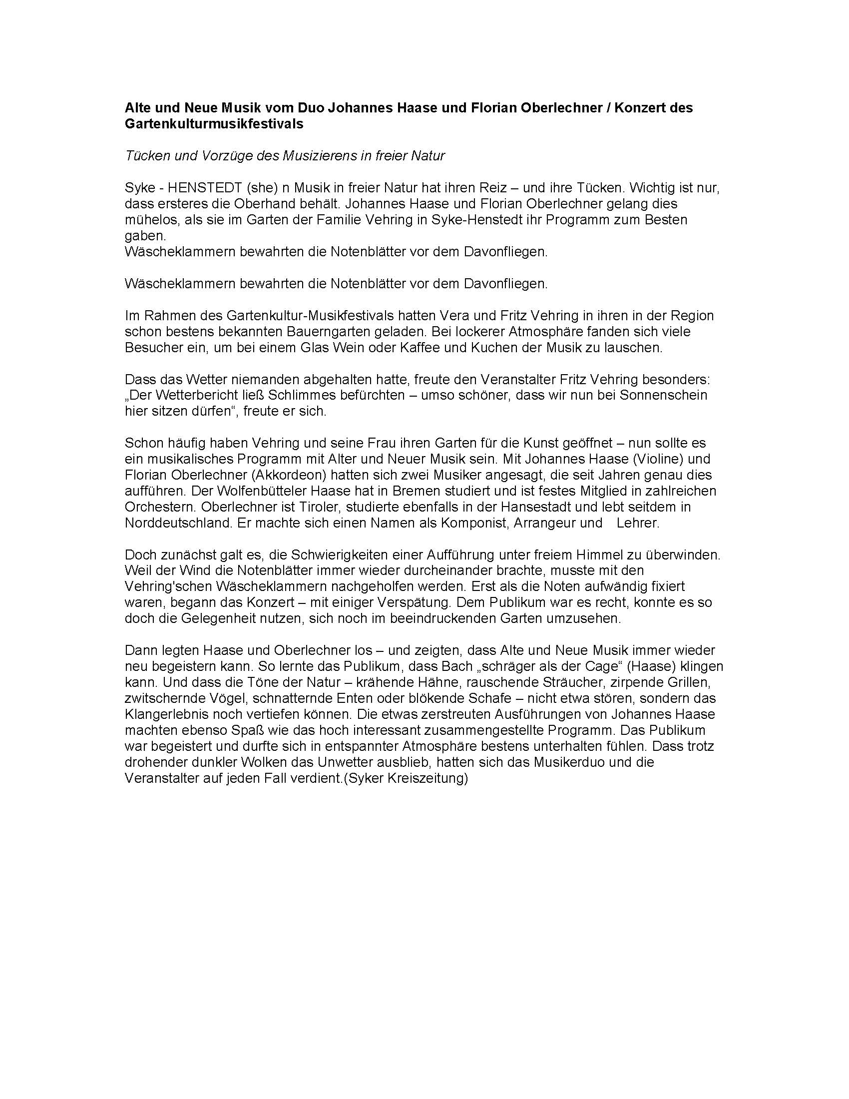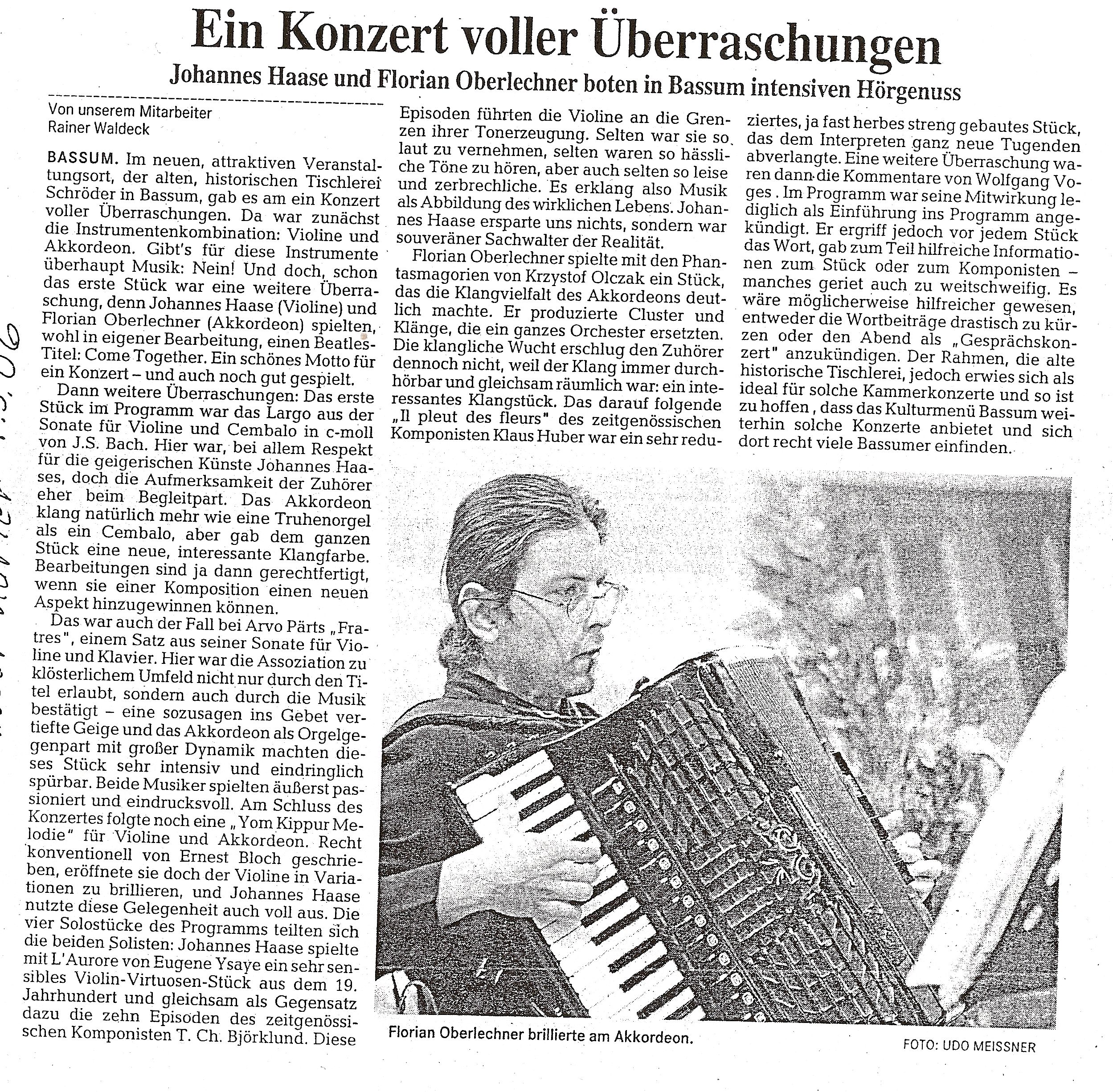 Wolfsburger Allgemeine Zeitung: "...Dass mit dem Akkordeon nicht nur volkstümliche Klänge möglich sind, zeigte Florian Oberlechner. Der österreicher, der in Bremen Akkordeon studierte, spielte Bach, zeitgenössische Stücke und eigene Kompositionen..."