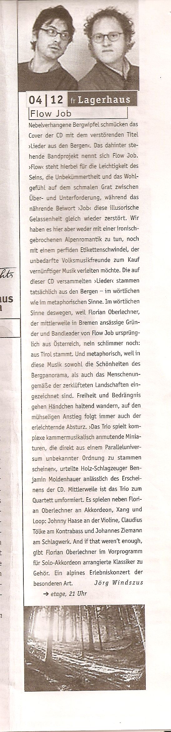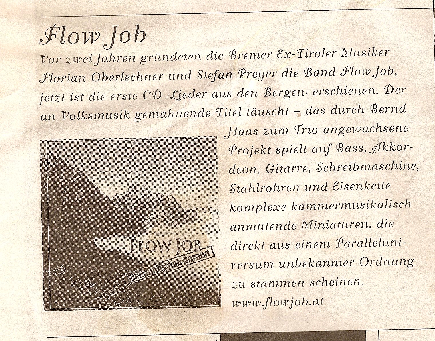 www.ivb.at: "das tiroler trio überraschte mit einer kreativen mischung aus volksmusikalischen ansätzen gemischt mit jazz und rap. bei schönem wetter verweilten viele passanten bei der ivb-bühne in der maria-theresien-straße. flow job fiel auf jeden fall auf und weckte interesse bei den zuhörerInnen."